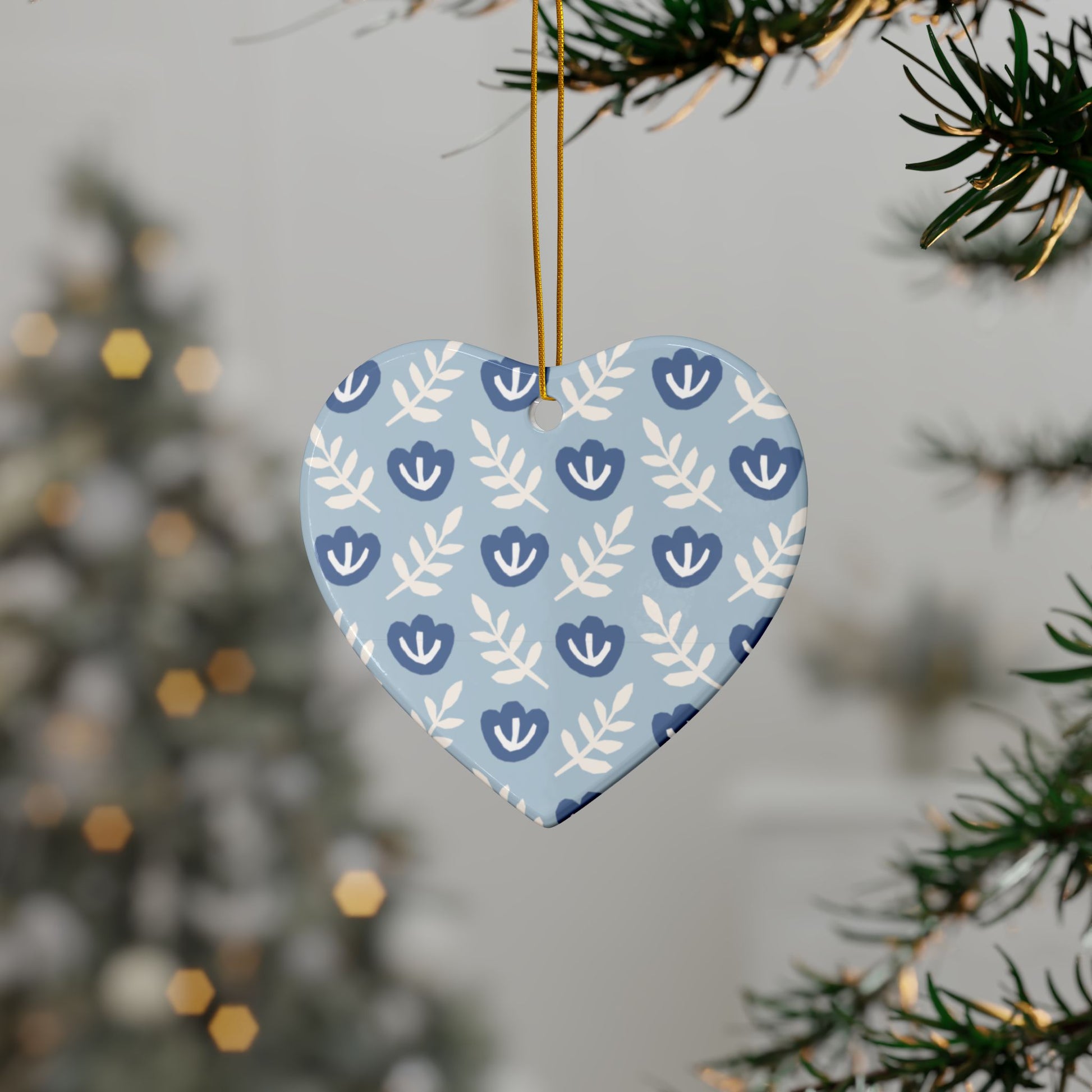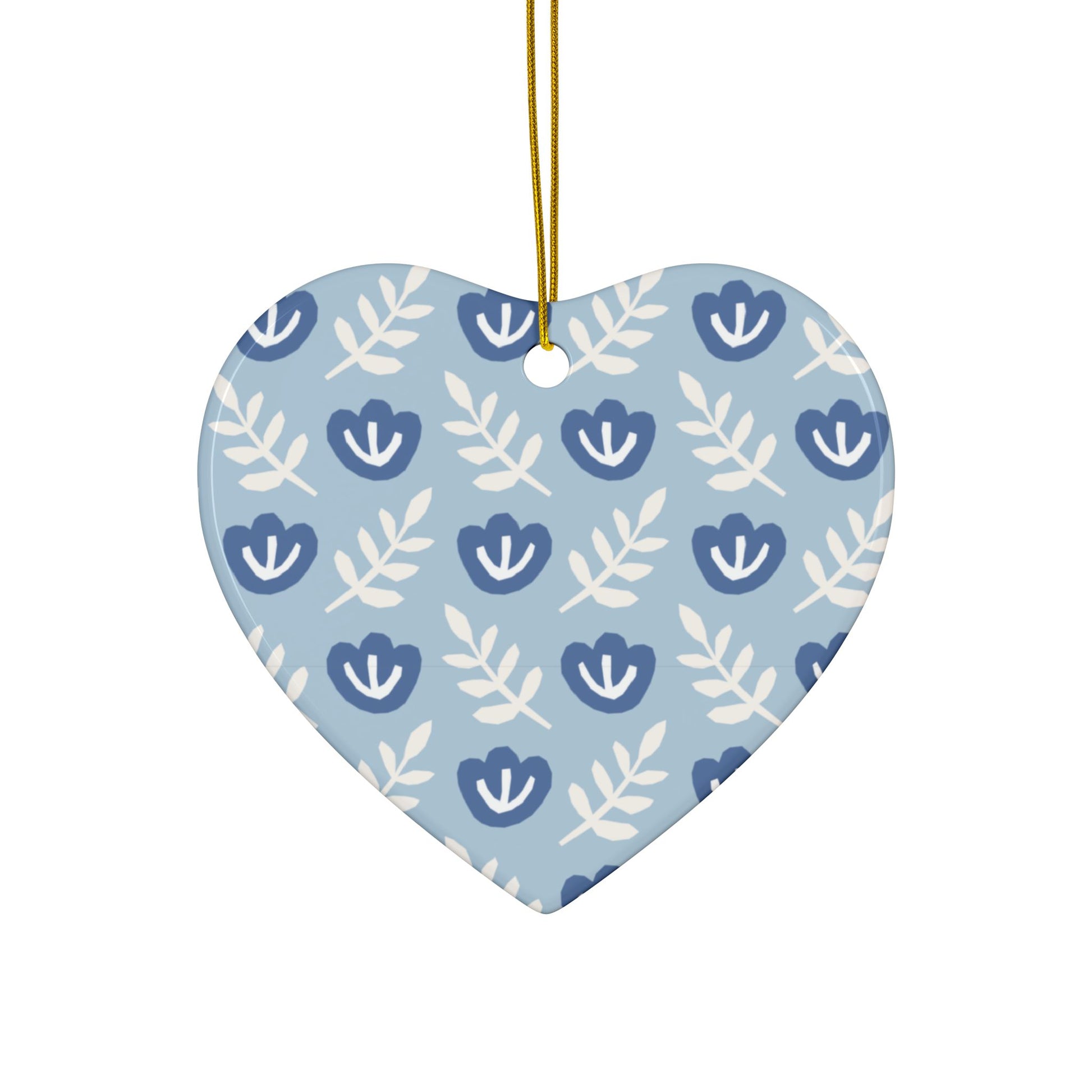 A little circle of calm to hang where small moments matter. These glossy ceramic ornaments carry the same soft, hand-drawn floral pattern on both sides — cool powder-blue background, deep navy blooms, and delicate white sprigs — so they catch light and keep looking crisp from every angle. Lightweight yet solid, each disc arrives with a slim gold hanging string ready for a branch, a doorknob, or a seasonal display. Choose one or pick a bundle to scatter across a tree, fill a bowl, or tie onto wrapped packages. They bring a quiet, crafted touch to holiday rituals, cozy winter scenes, or everyday corners that need a gentle, modern floral accent.