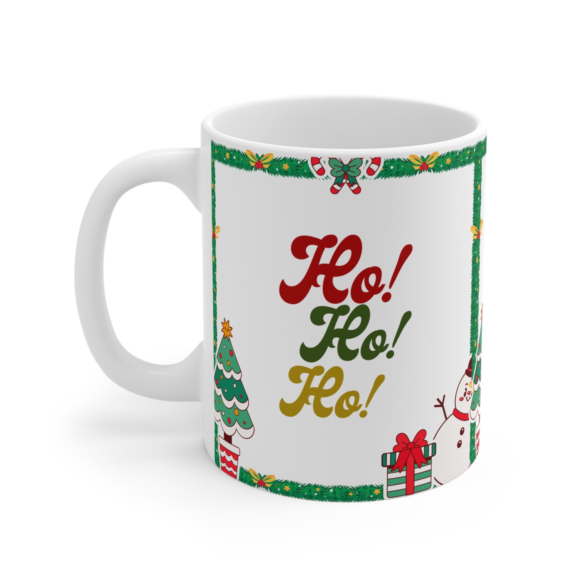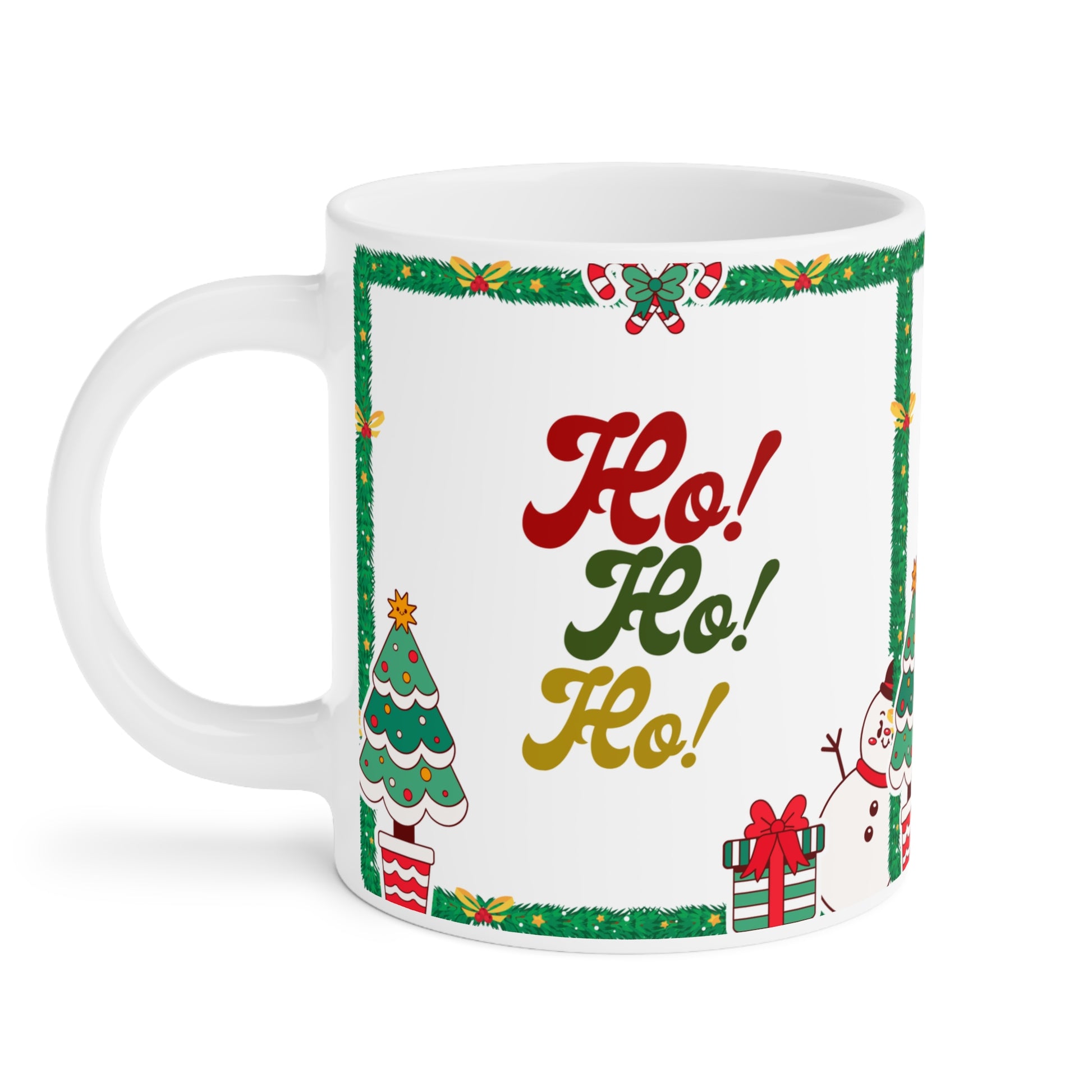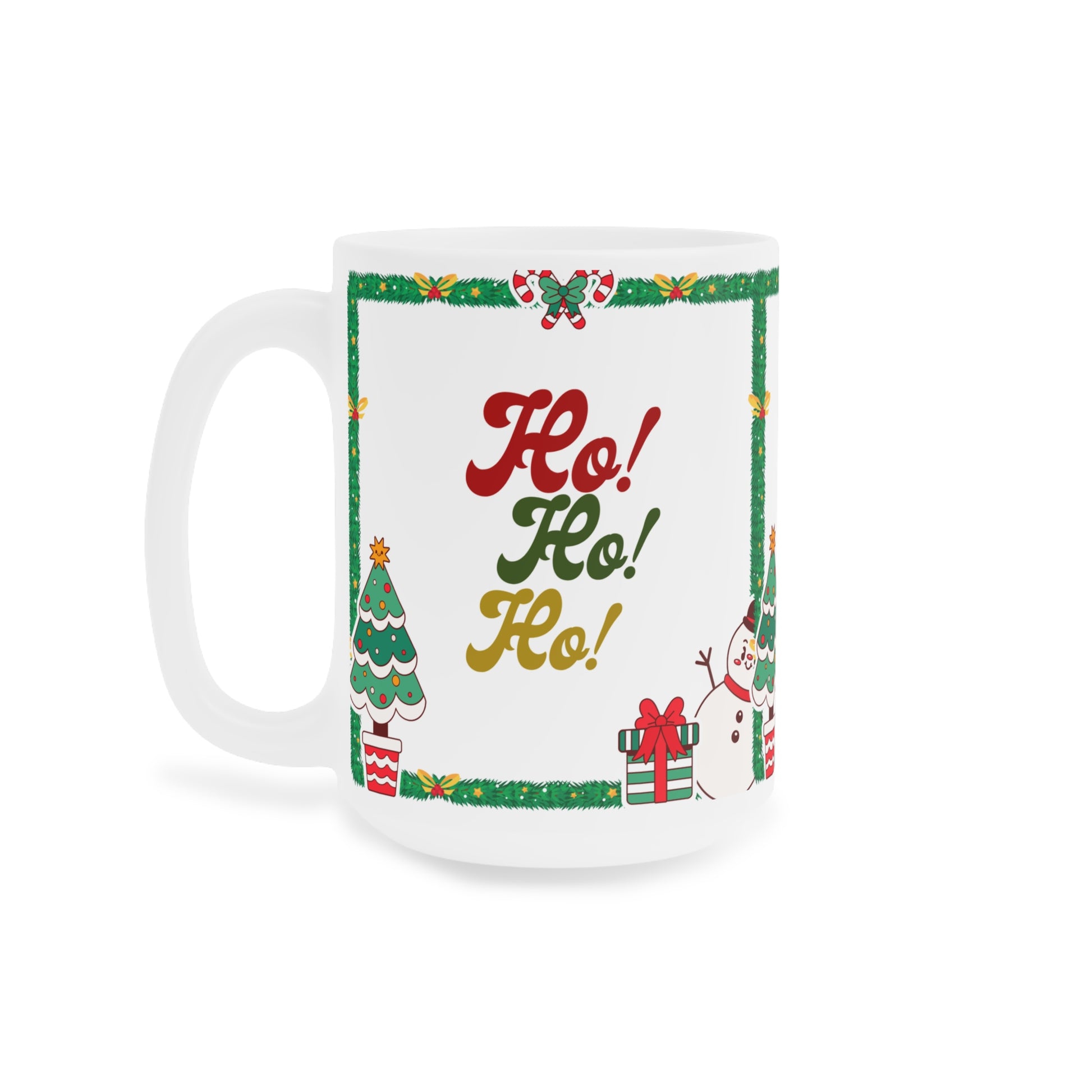 Sip a little holiday cheer from a bright, festive ceramic mug that puts the season on full display. Cheerful illustrations — a smiling snowman, decorated tree, wrapped presents and a holly-framed border — surround bold “Ho! Ho! Ho!” lettering in classic red, green and gold. The smooth white ceramic keeps colors vivid and the large C-handle feels steady in your hand as you cradle a steaming cocoa or morning coffee. It’s the kind of mug that brings a warm smile every time you reach for it, turning quiet mornings or cozy gatherings into small moments of seasonal joy.