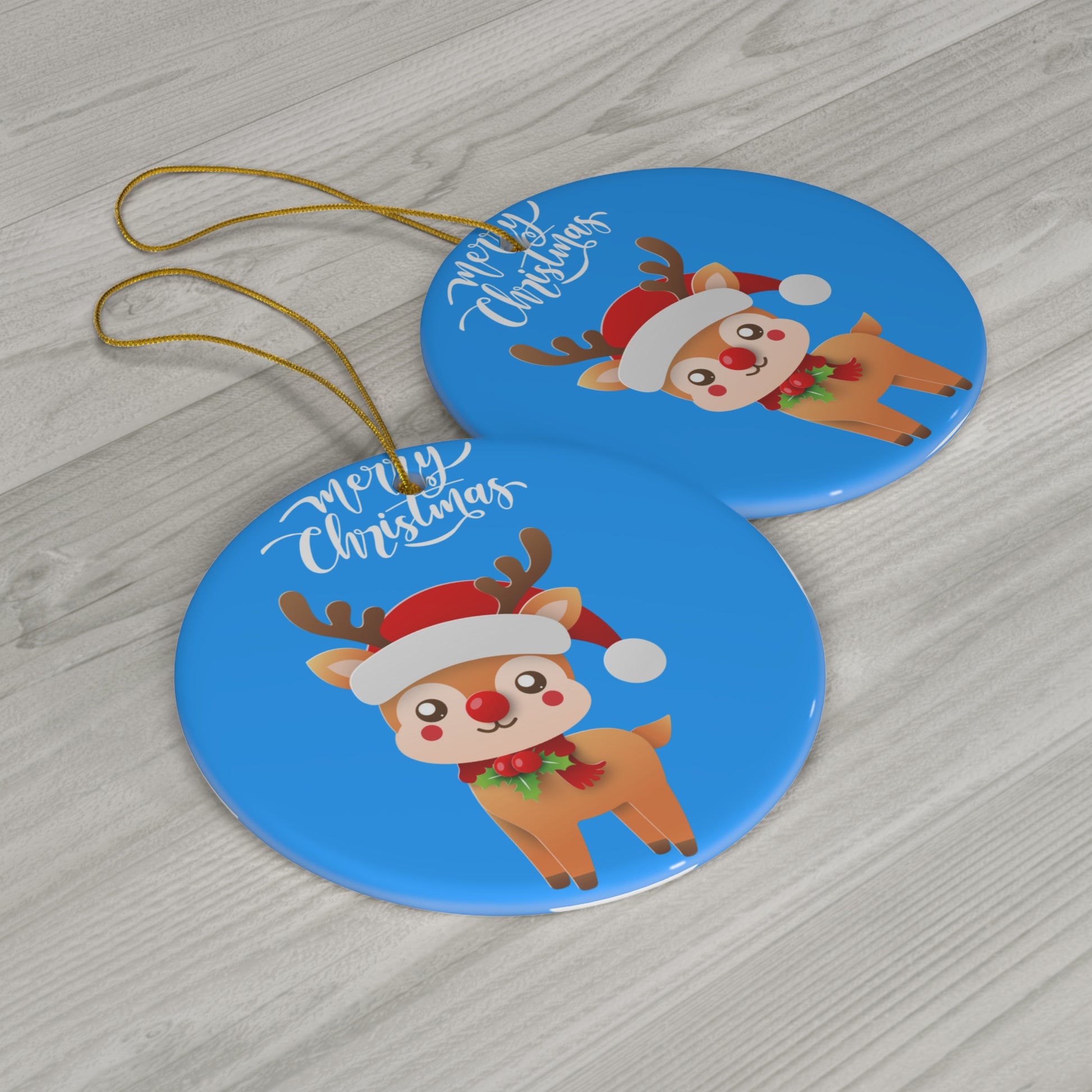 Christmas Reindeer Ceramic Ornament — Cute Santa Hat Reindeer, "Merry Christmas" Holiday Tree Decoration