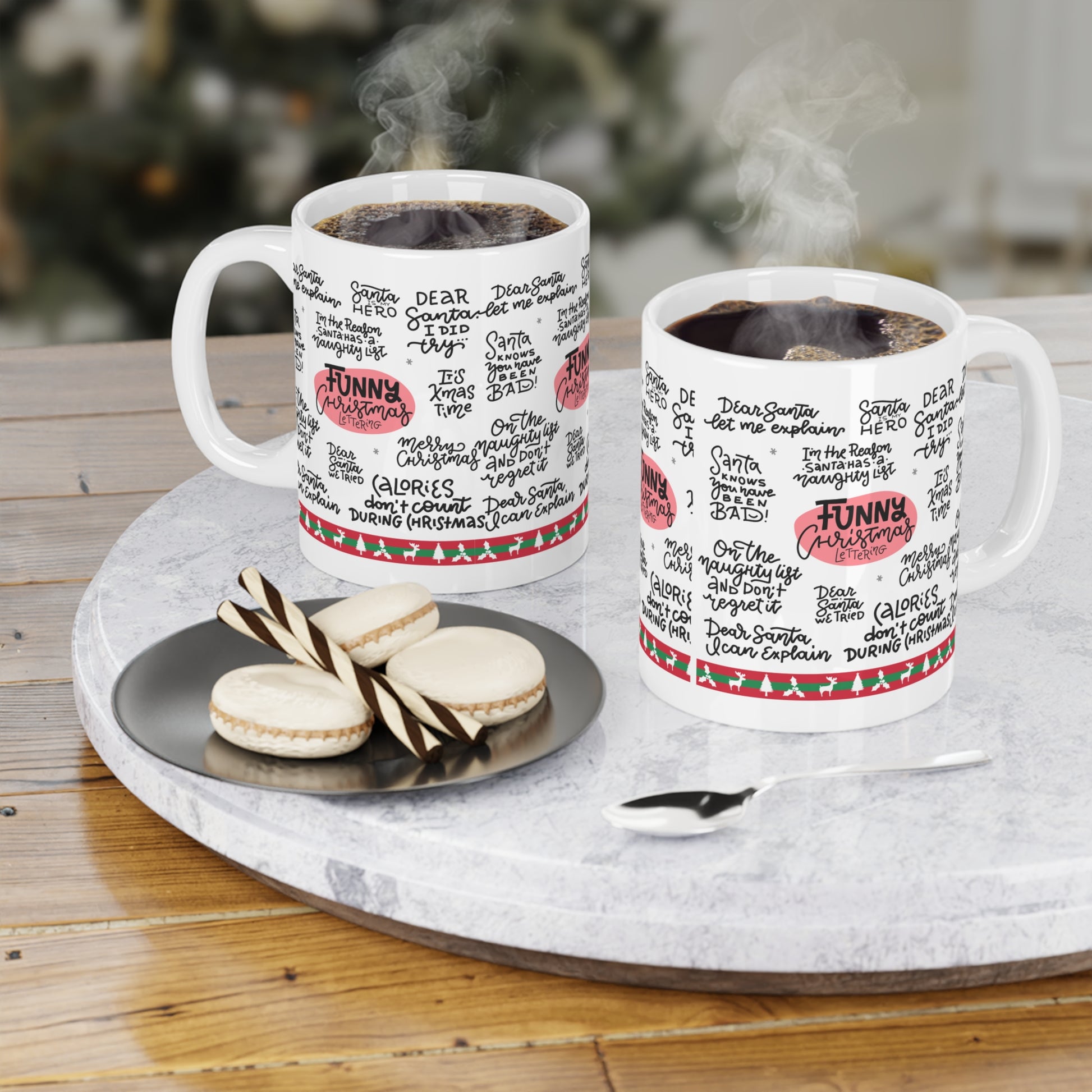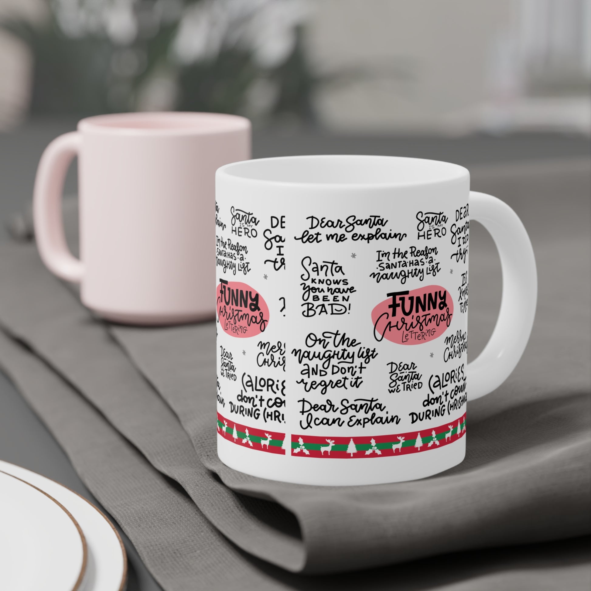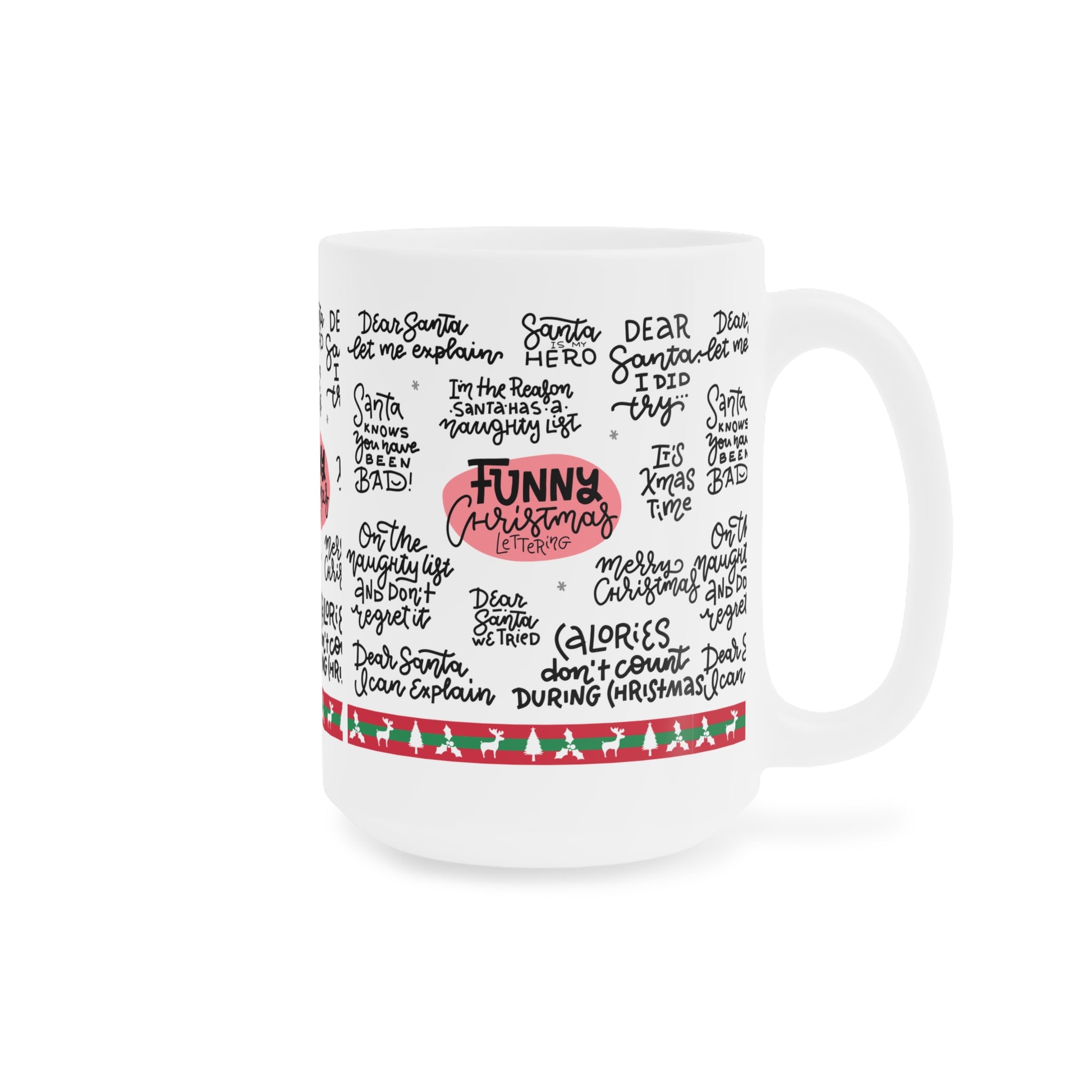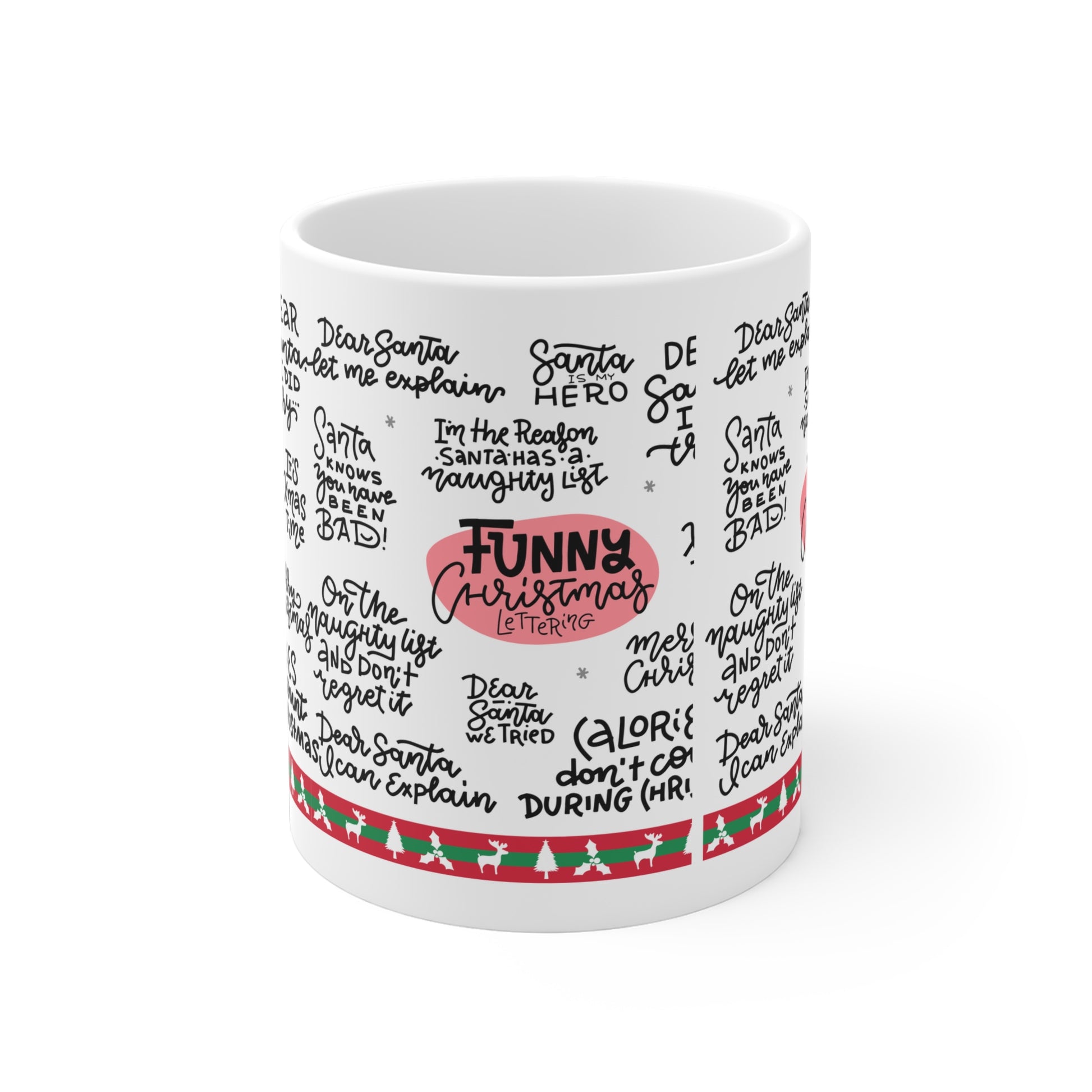 Funny Christmas Quotes Ceramic Mug — Holiday Coffee Cup with Festive Handwritten Sayings