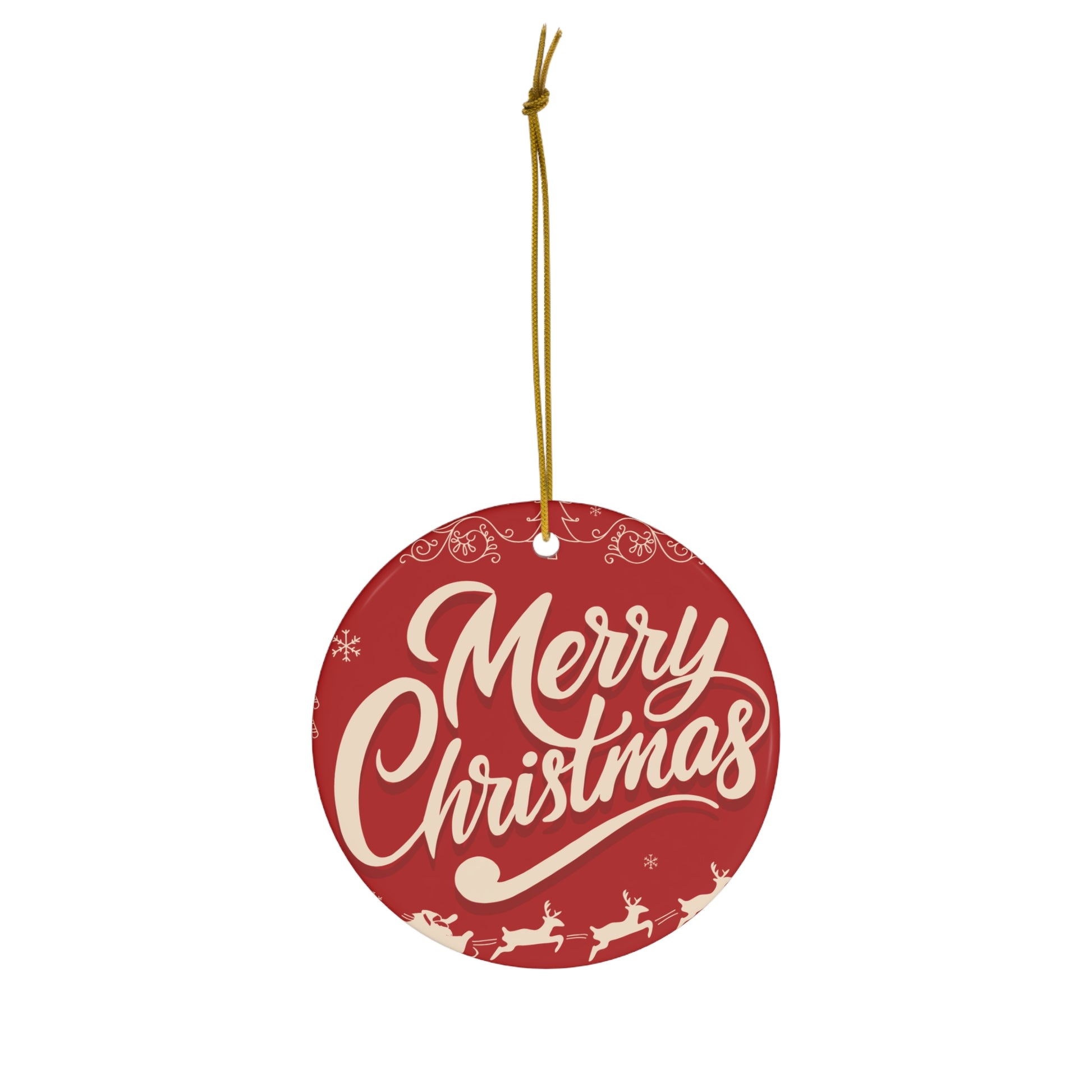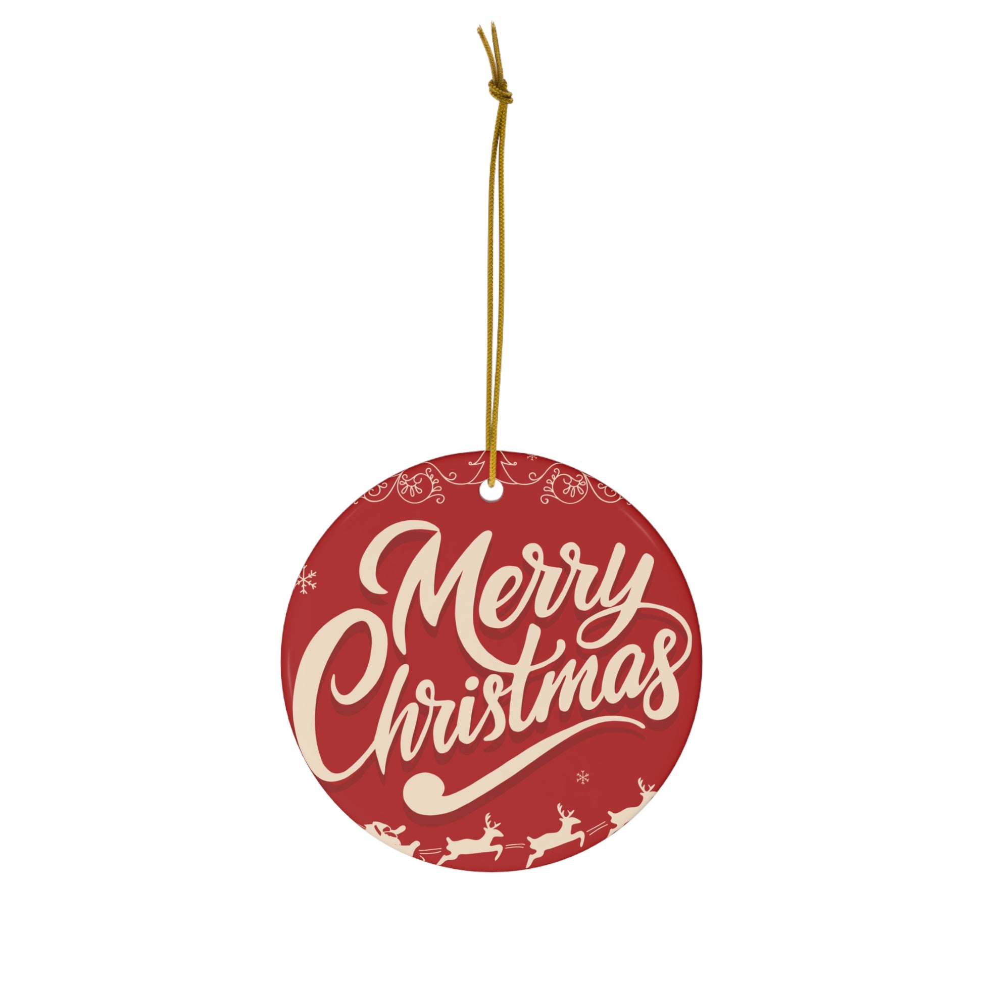 A warm, round porcelain ornament that brings classic holiday cheer to any tree or wreath. The double-sided print shows a vintage-inspired “Merry Christmas” script on a deep red background, accented by tiny reindeer and snowflakes. Lightweight but solid, the smooth edges and fine 4mm porcelain give it a refined handmade feel. A gold hanging ribbon is included so it arrives ready to display on Christmas mornings, in cozy entryways, or strung across a seasonal garland.