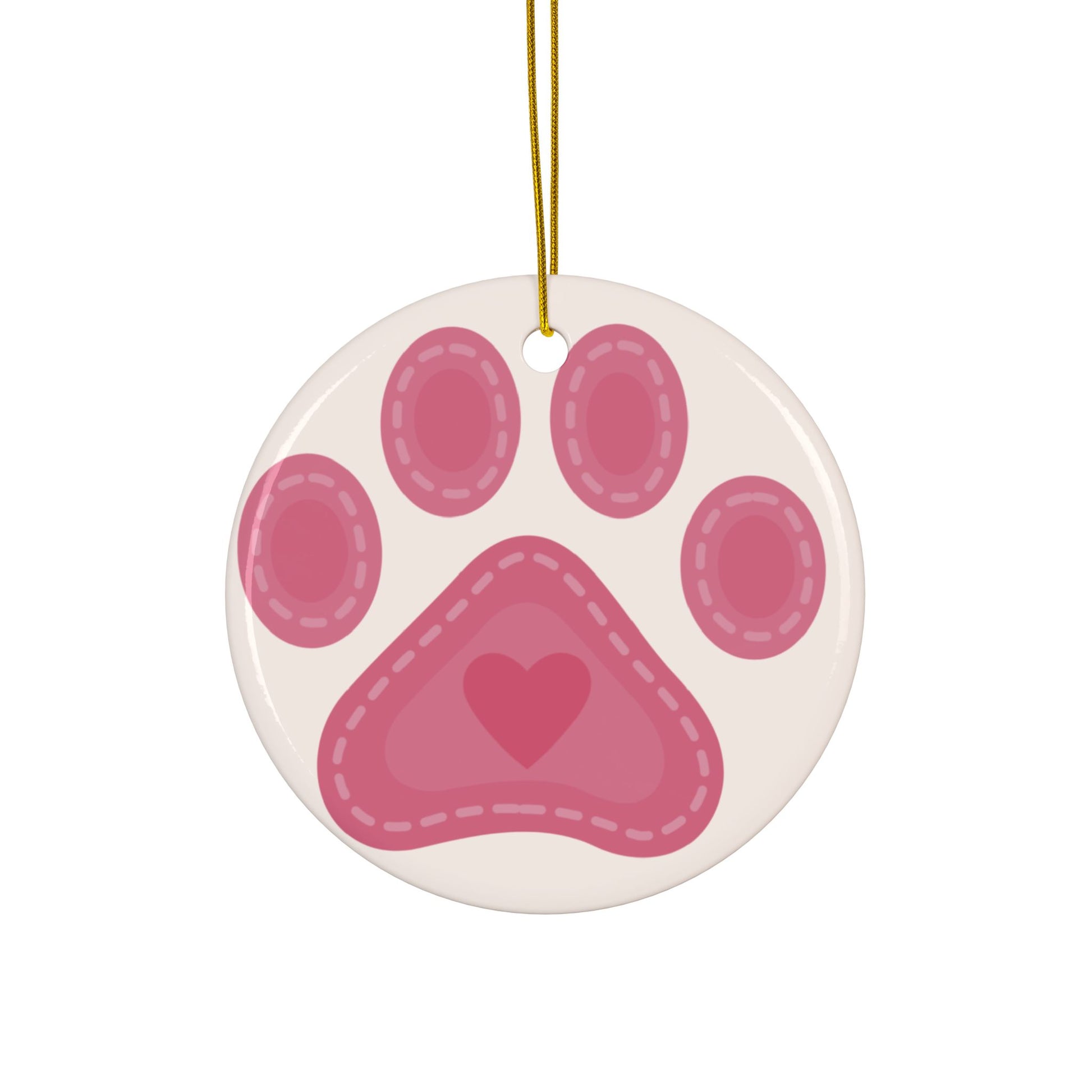 A glossy ceramic ornament that captures a playful, sentimental moment—two-sided print so the cute paw pad stays visible from every angle. Lightweight yet sturdy, it hangs from a gold string and brings a soft pop of pink to a tree, wreath, or pet memorial corner. The smooth ceramic surface holds bright, crisp colors that make the stitched paw and tiny heart look hand-sewn. Choose from multiple shapes and bundle sizes to match your display or share with fellow pet lovers.