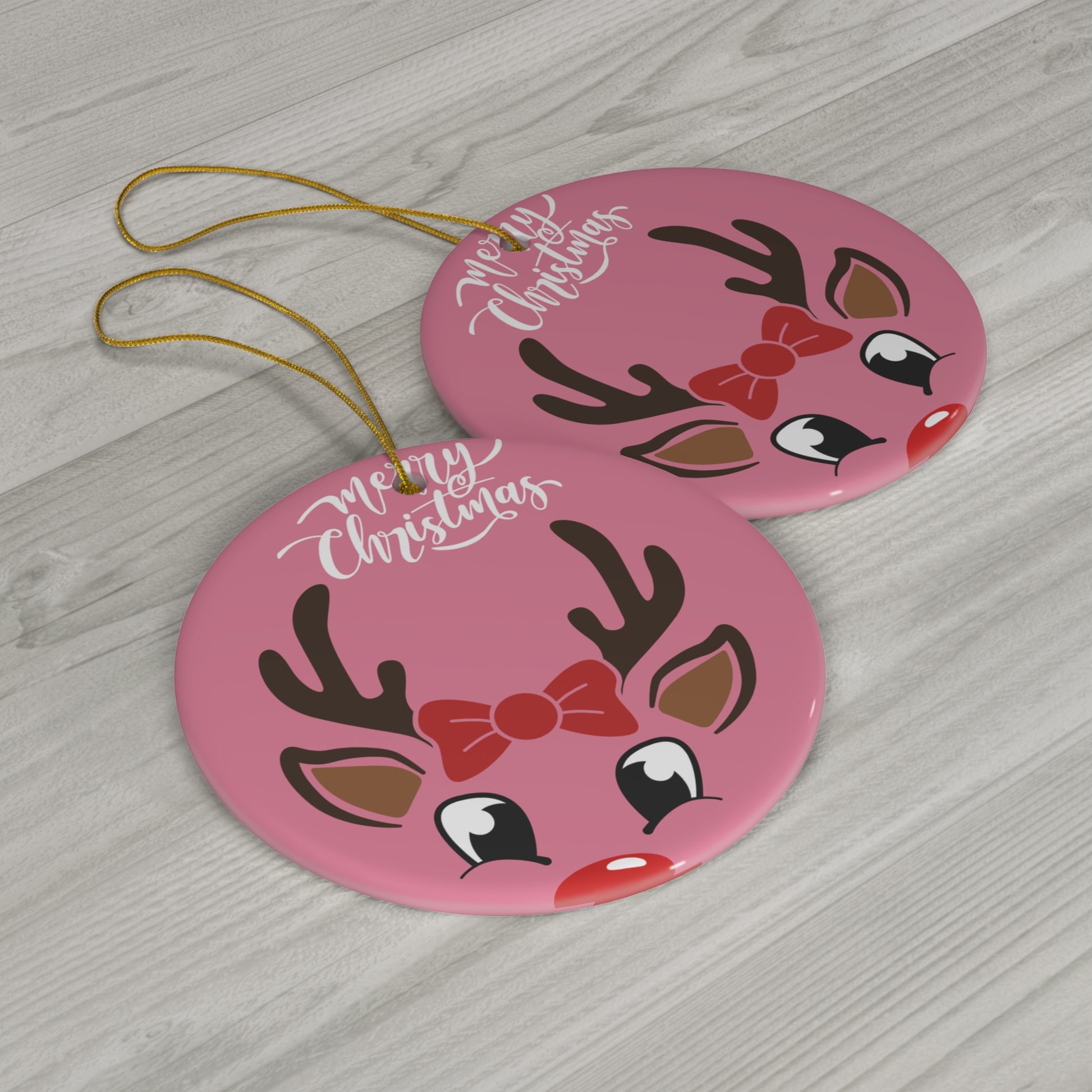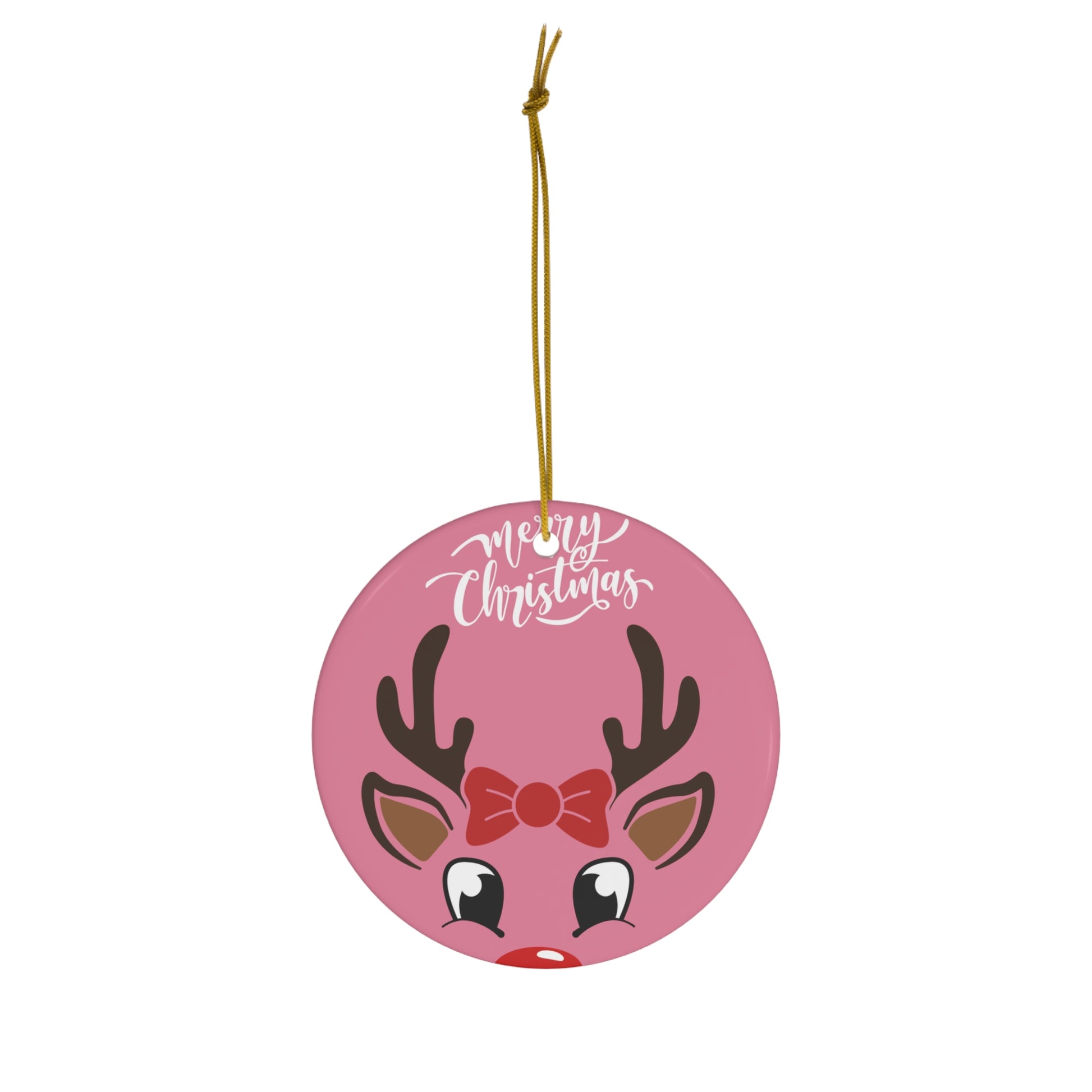 Pink Reindeer Ceramic Ornament – 'Merry Christmas' Holiday Tree Decoration