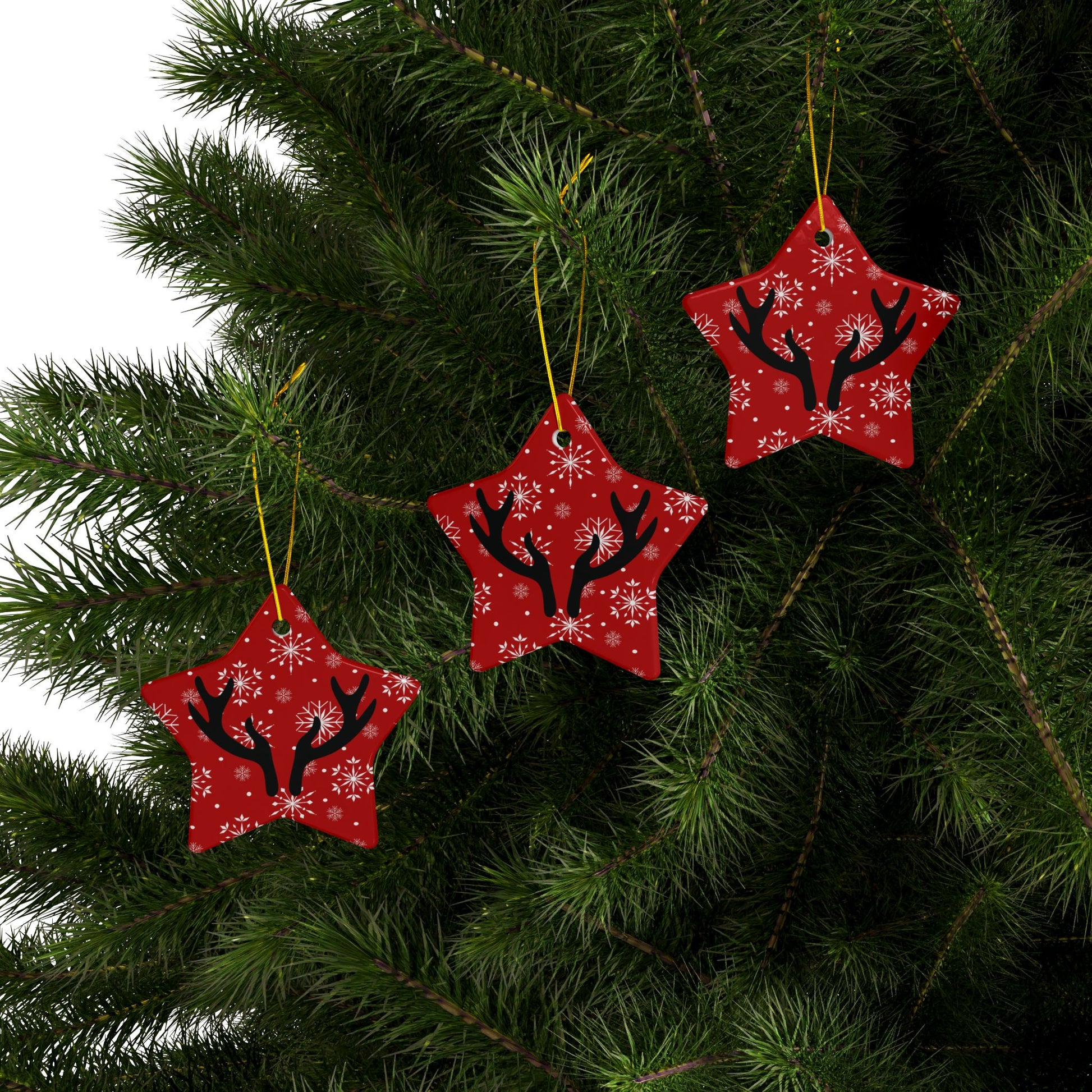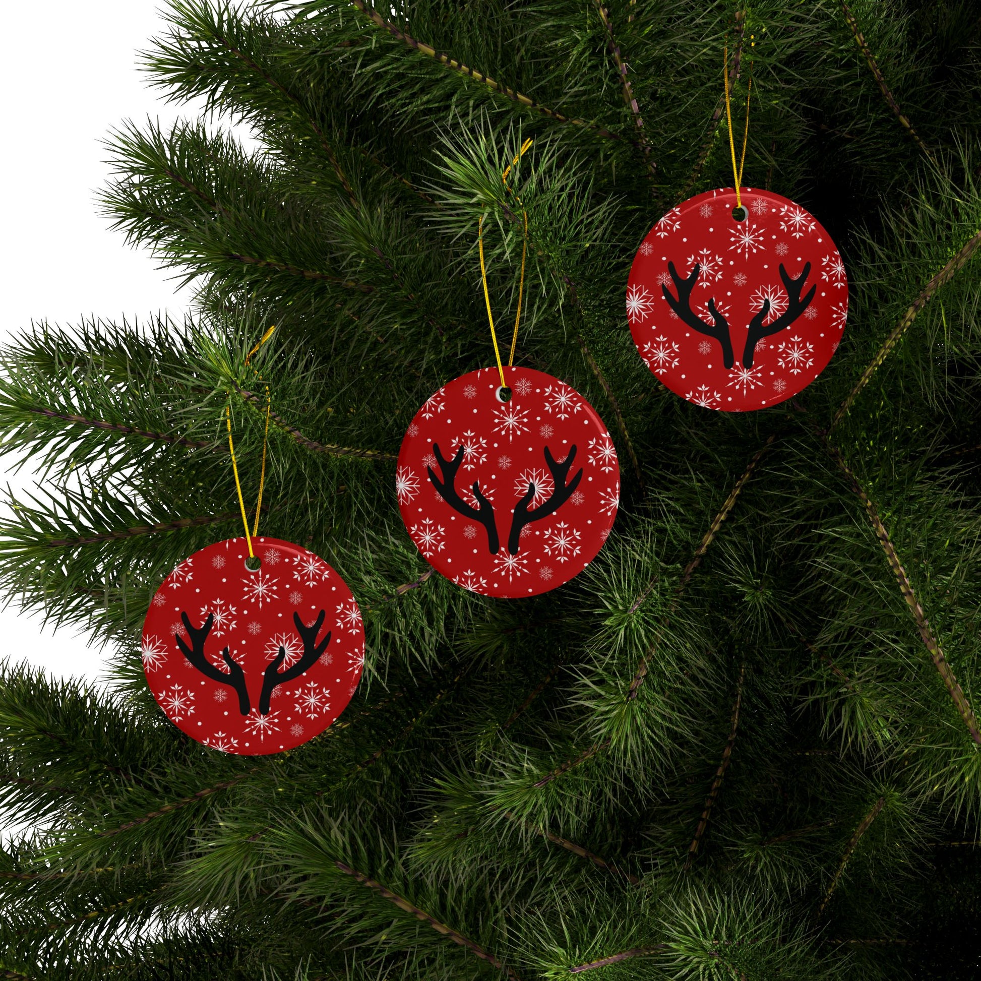 Bright red ceramic ornaments that bring a playful, wintry mood to holiday spaces. Each round ornament features bold black antlers set against a field of crisp white snowflakes, printed on both sides in vivid, glossy color. Lightweight but sturdy, the ceramic surface catches light and makes the colors pop from every angle. Hung by the included gold string, these ornaments add a touch of cheerful charm to a tree, garland, or gift tag — a small, joyful detail that nods to cozy, festive traditions.