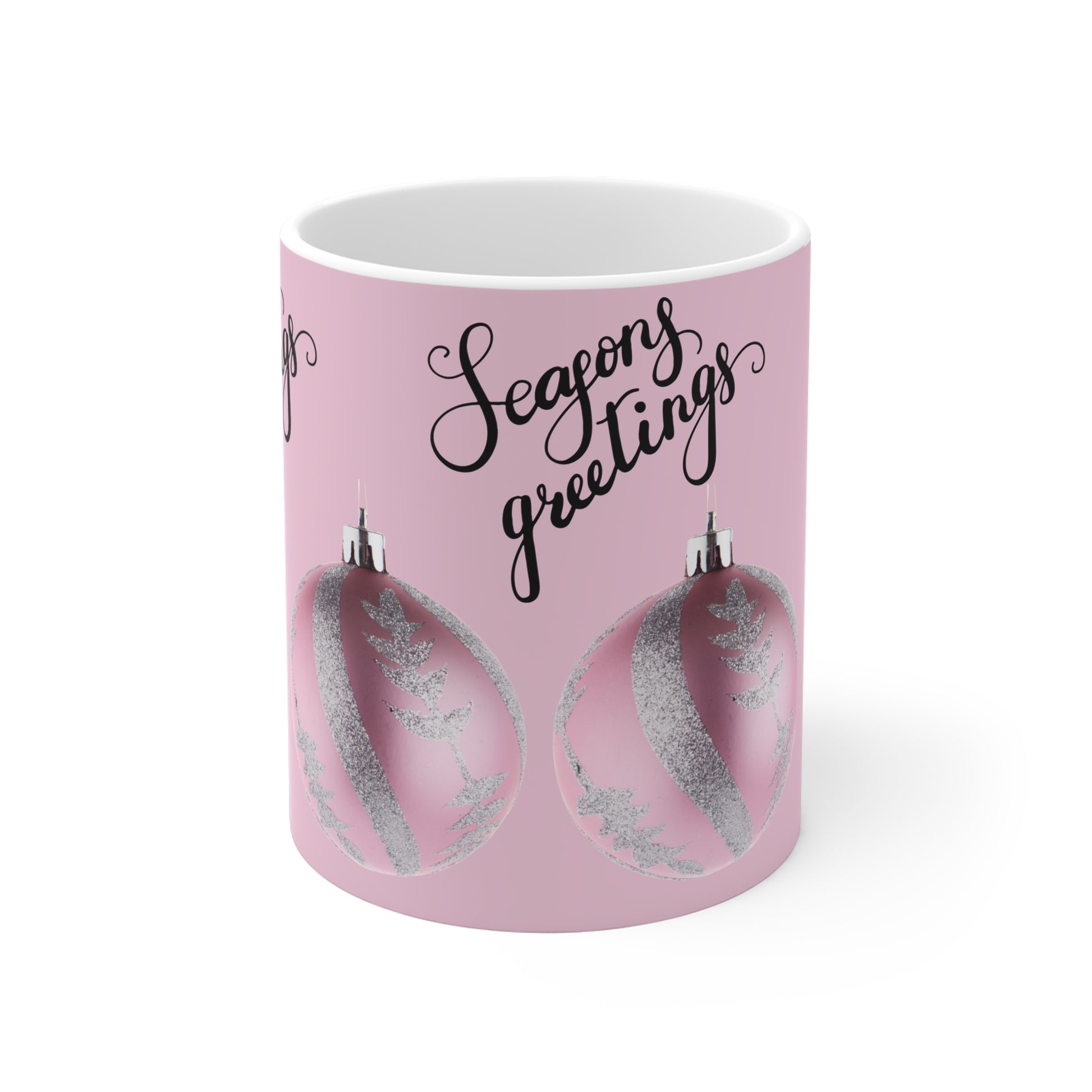 Warm pink, silver and script come together on this ceramic mug to bring a little holiday hush to slow mornings. Soft-pink glaze wraps around hand-drawn silver ornaments and a flowing “Seasons greetings” script, so every sip feels like a quiet moment beneath twinkling lights. The substantial C-handle and smooth, scratch-resistant finish make it easy to cradle hot cocoa or spiced tea while wrapped in a sweater. Choose the 11 oz, 15 oz, or generous 20 oz when you want more of that cozy, festive pause at breakfast, at the office desk, or beside the tree.
