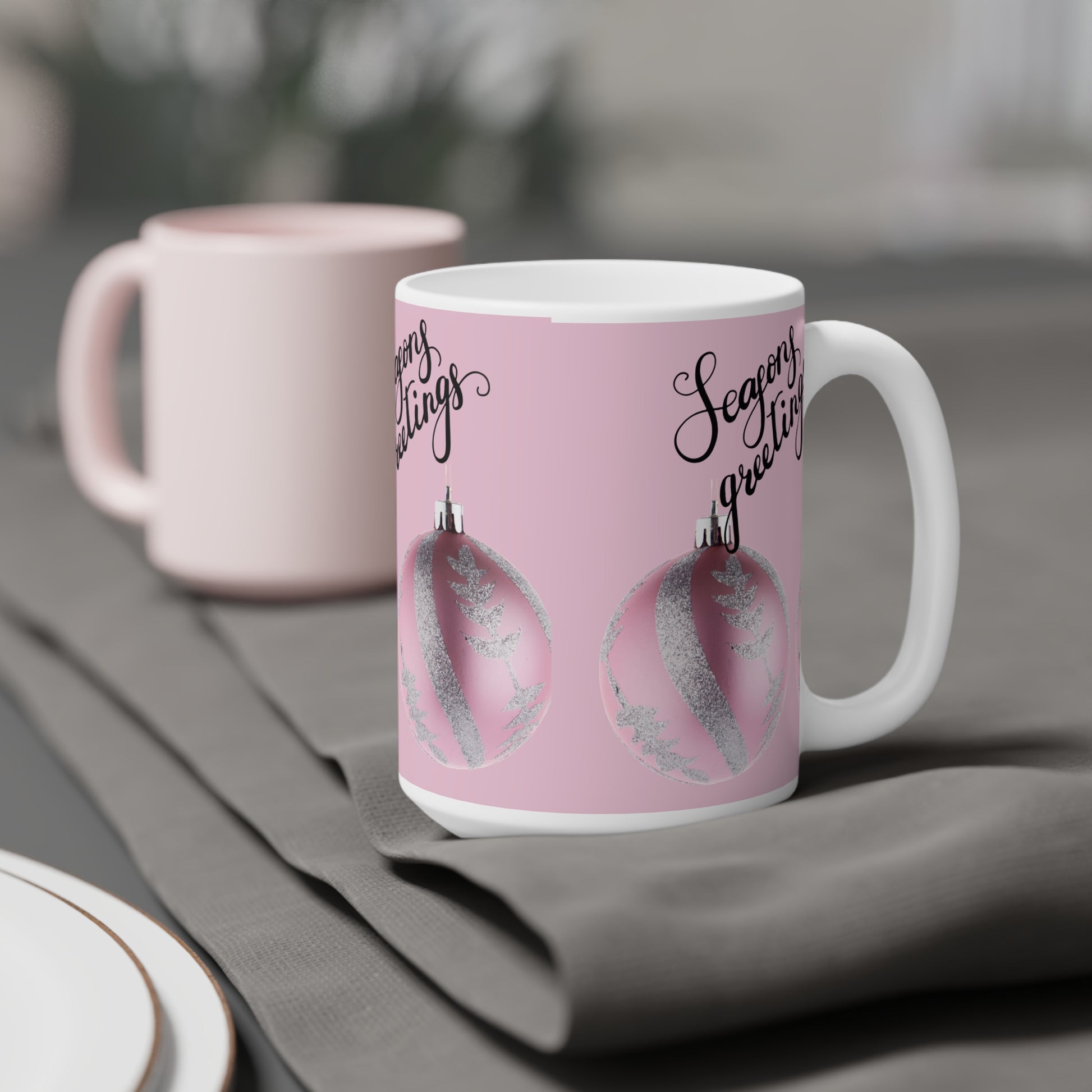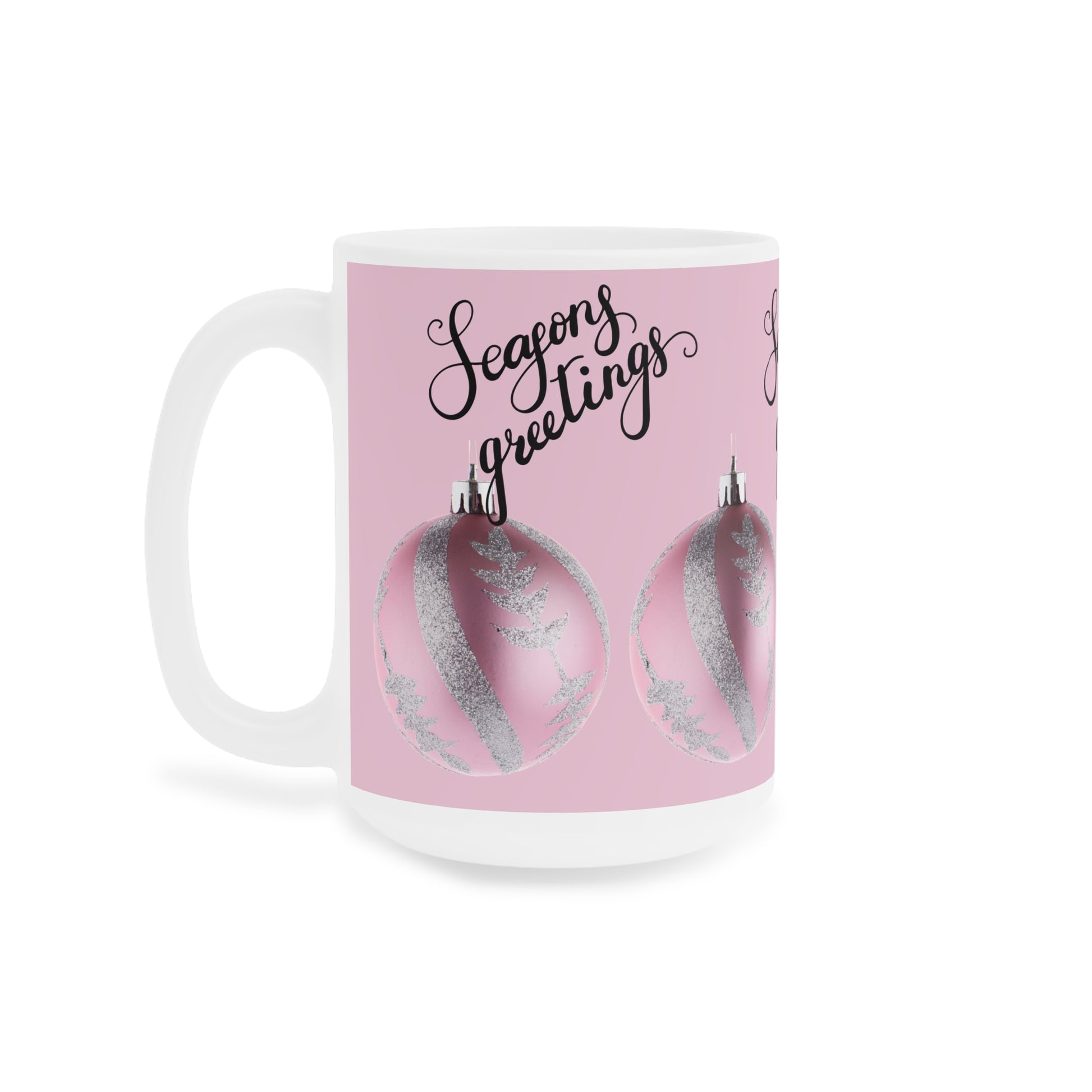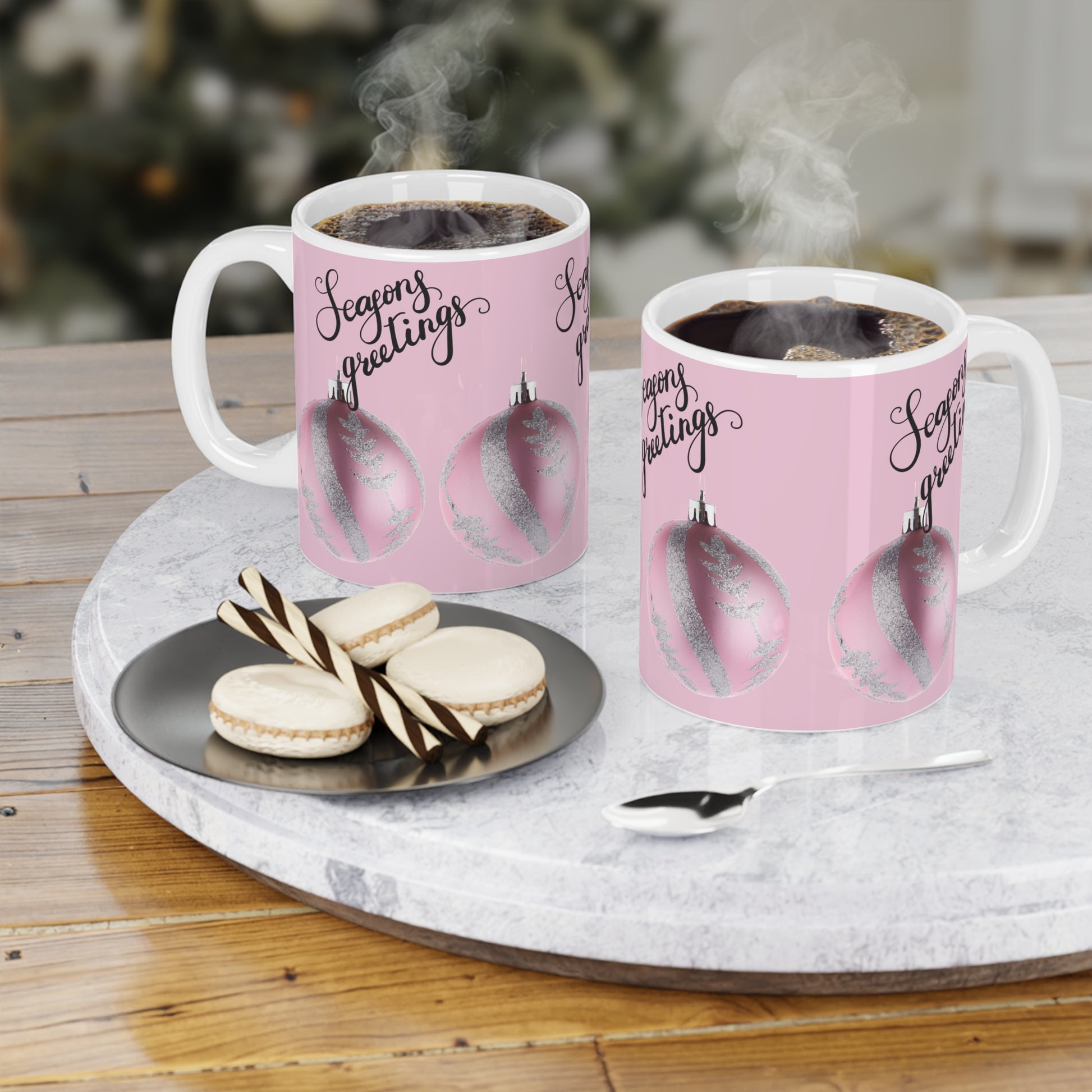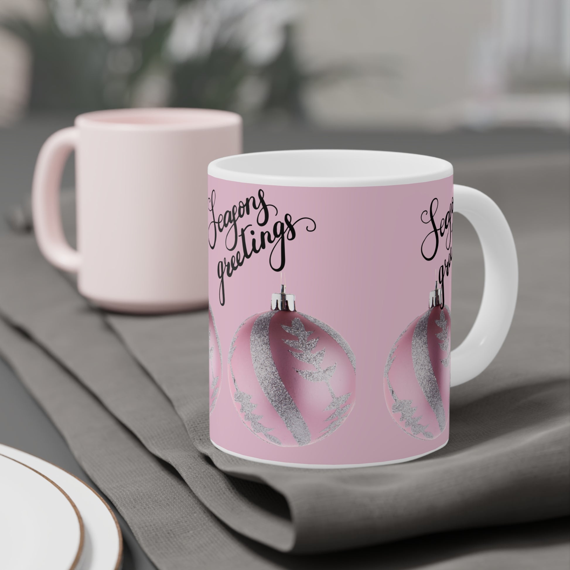 Season's Greetings Pink Ornament Ceramic Mug — Holiday Coffee Cup (11oz/15oz/20oz)